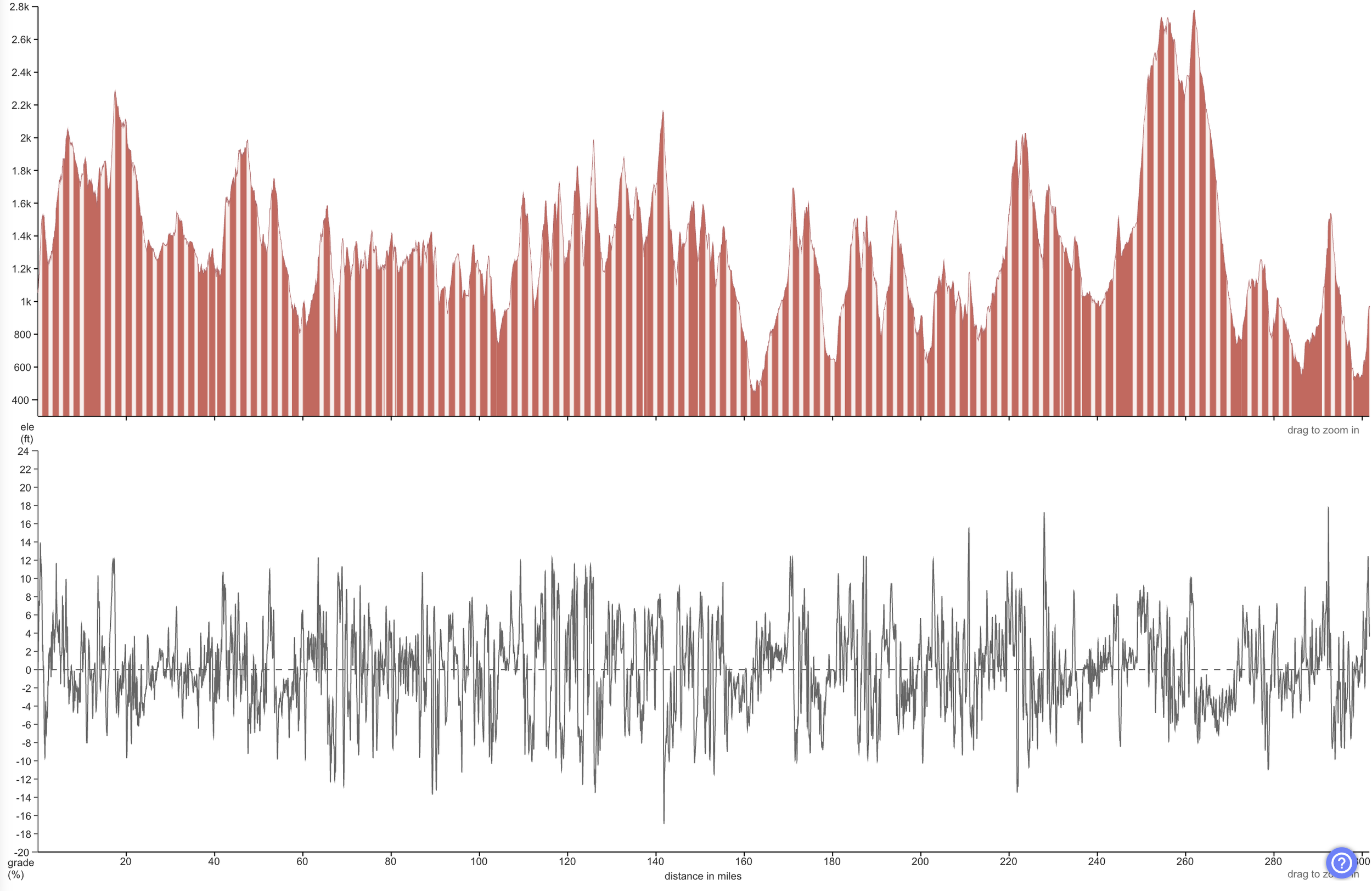 The top is the elevation profile and the bottom is the gradient, so anytime the black line goes over the center 0 dotted line, we’re going uphill. If anything Ride with GPS, used here, underestimates gradient as a result of averaging, so there are dozens of climbs that tip into the high teens and mid-20% grade.